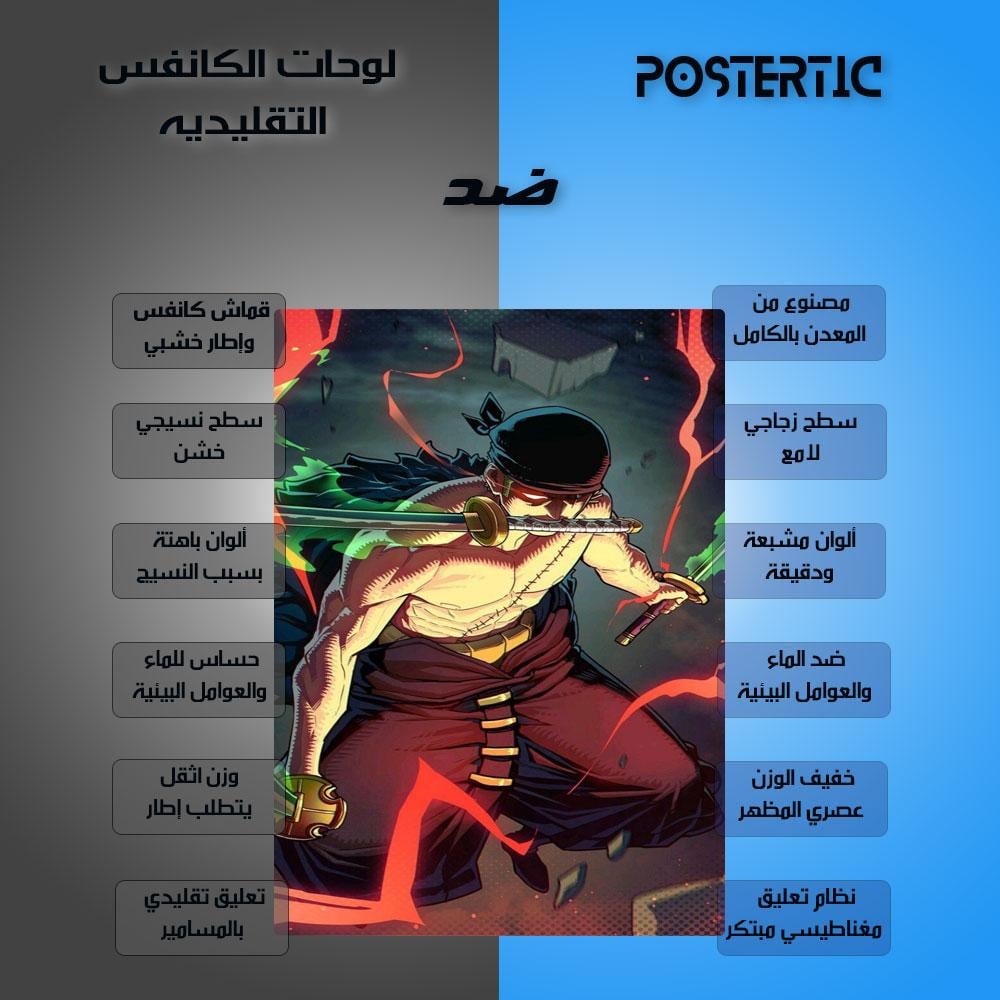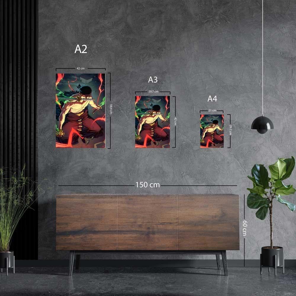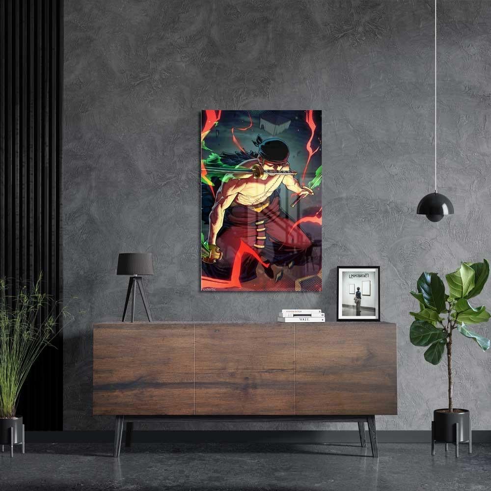 أشعل حماسك وأضف وهج قوة رورونوا زورو إلى مساحتك مع هذه اللوحة المعدنية الفنية! يعرض هذا البوستر شخصية رورونوا زورو، سياف قراصنة قبعة القش الأسطوري، في وضعية قتالية كلاسيكية بسيوفه الثلاثة، محاطًا بهالة من اللهب الأحمر التي تعكس قوته الهائلة وطاقته القتالية المتفجرة. مطبوعة بجودة HD فائقة على معدن متين، هذه اللوحة ستكون إضافة ملحمية لمحبي أنمي "ون بيس" وعشاق شخصية زورو القوية.