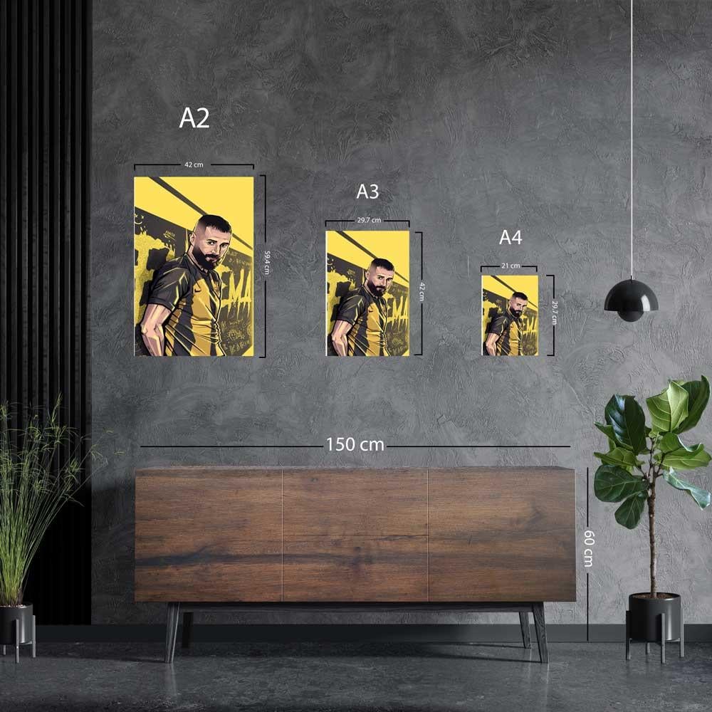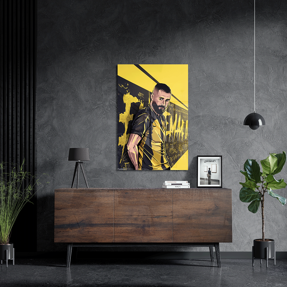 دع الإلهام يضيء جدرانك مع هذه اللوحة المعدنية المذهلة التي تصوّر رسمًا فنيًا مميزًا للنجم كريم بنزيما بقميص نادي الاتحاد! تصميم فريد يجمع بين الروح الرياضية والإبداع الفني، ويضفي لمسة من العظمة والتميز على أي مكان."