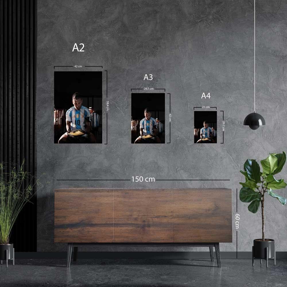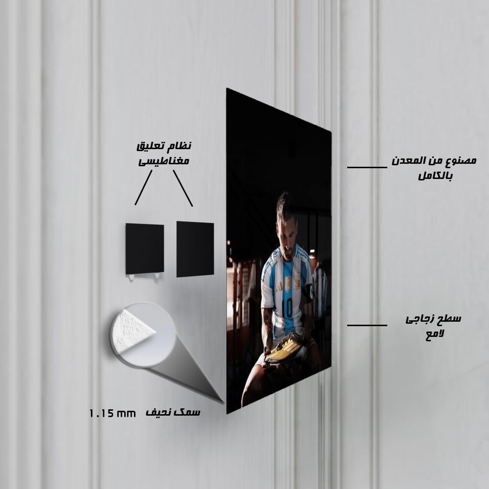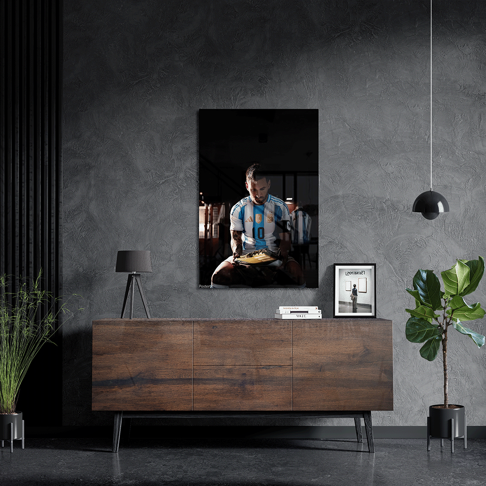 قطعة فنية رائعة تجسد أسطورة كرة القدم، ليونيل ميسي، في لحظة تألقه. يظهر ميسي في البوستر وهو يحمل حذاءً ذهبيًا، رمزًا لإنجازاته الكروية المذهلة. لوحاتنا مصنوعة من معدن عالي الجودة بتقنية طباعة HD لضمان ألوان زاهية وتفاصيل دقيقة تدوم لسنوات طويلة. وسهلة التعليق باستخدام النظام المرفق والذي لا يسبب اي ضرر للجدران (التفاصيل الكامله)