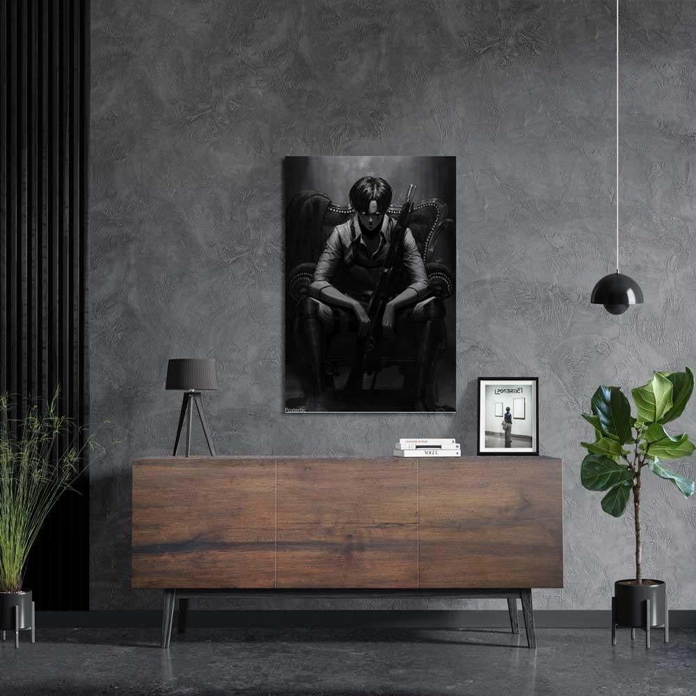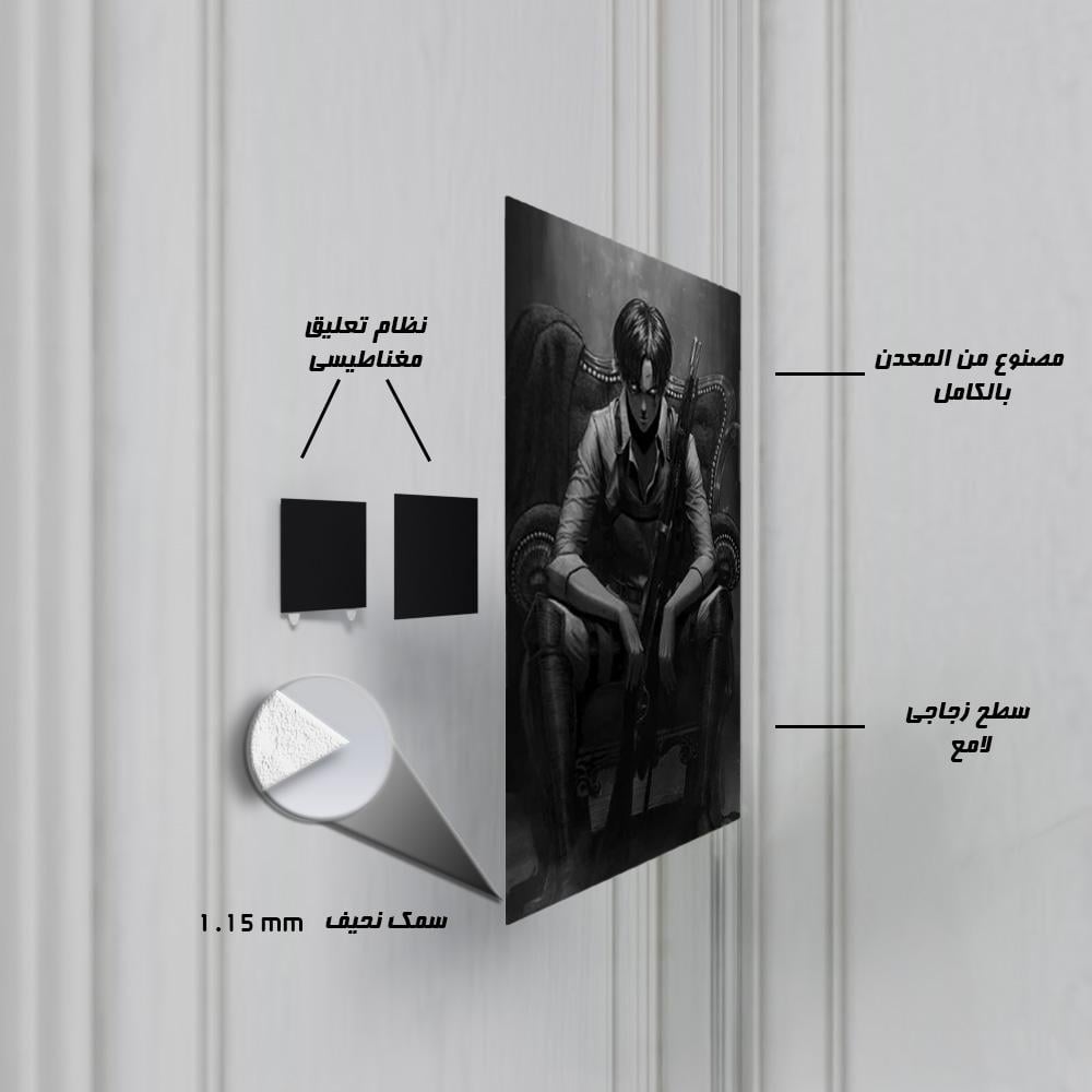 تحفة فنية فريدة من نوعها تجسد الكابتن ليفاي أكرمان بإطلالة قاتمة ومهيبة، تعكس هدوءه القاتل وقوته التي لا تُضاهى. تأتي هذه اللوحة المعدنية الفاخرة بتفاصيل دقيقة وطباعة معدنية عالية الجودة تمنحها لمسة من الفخامة والغموض، مما يجعلها خيارًا مثاليًا لعشاق هجوم العمالقة.